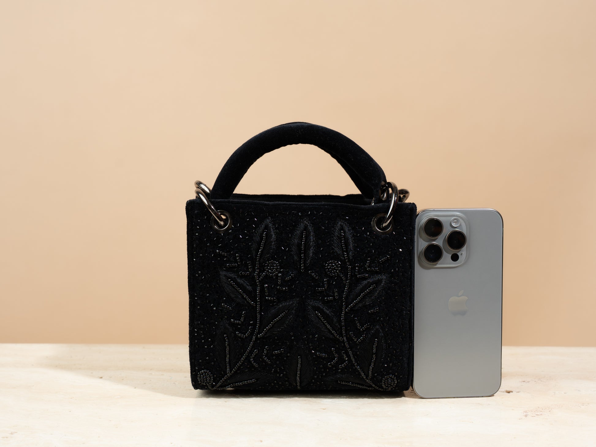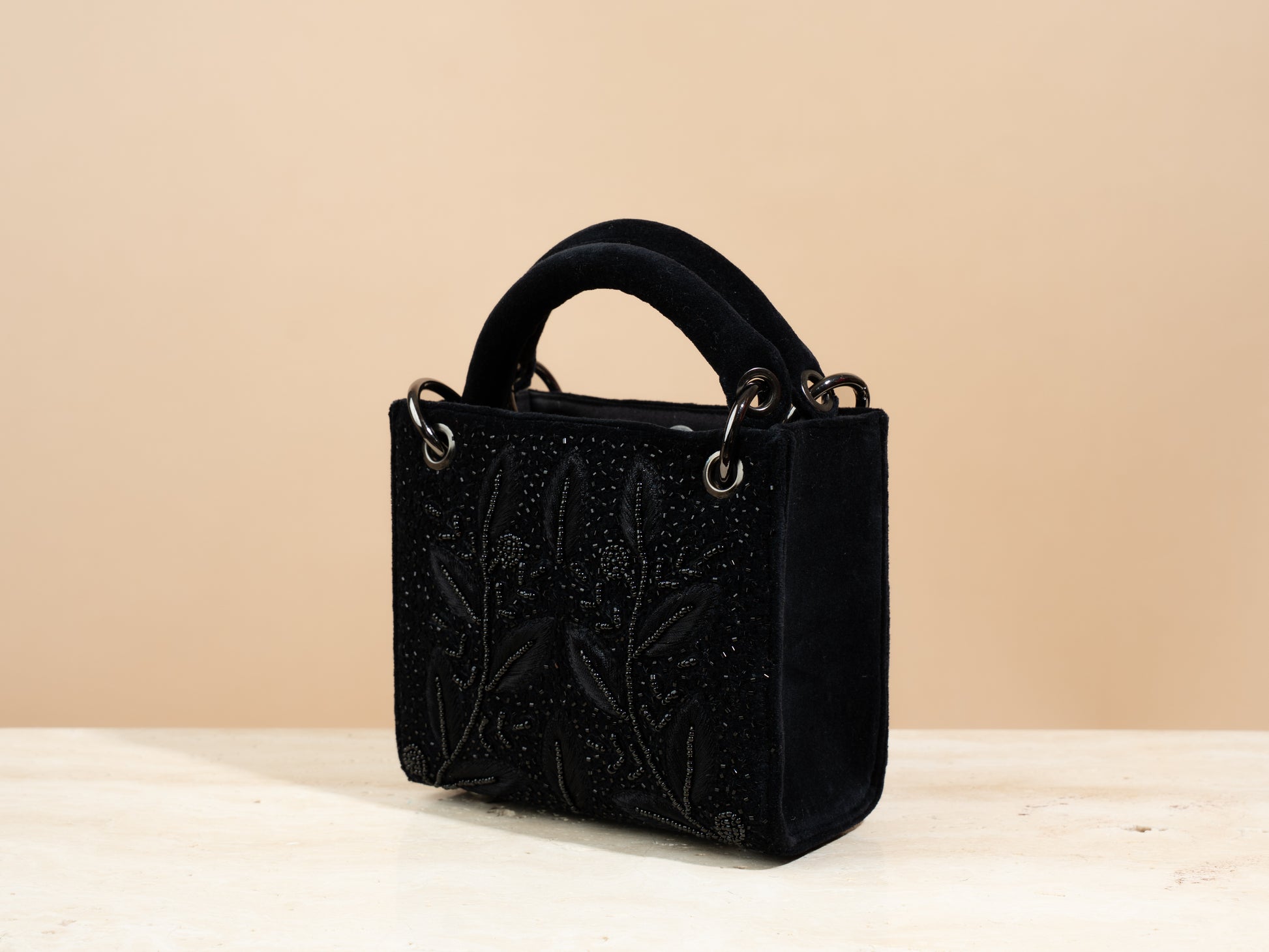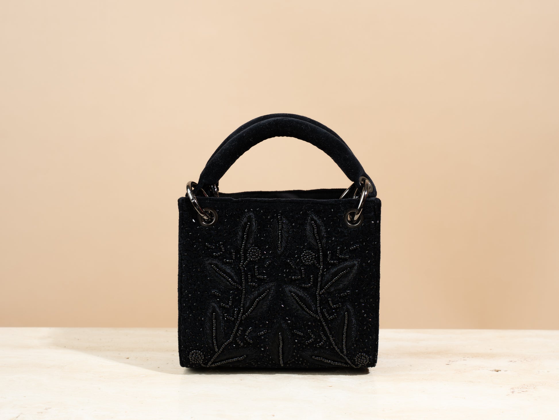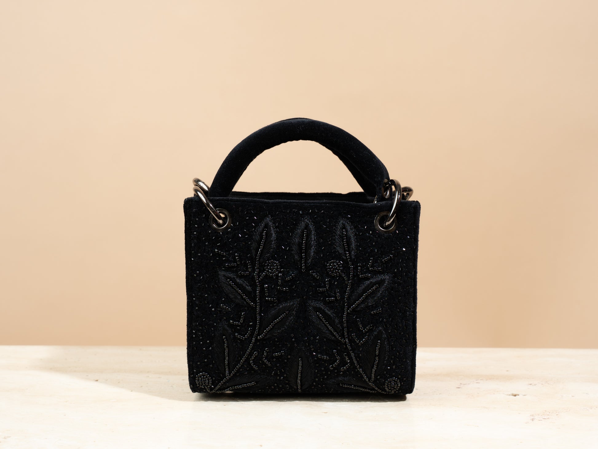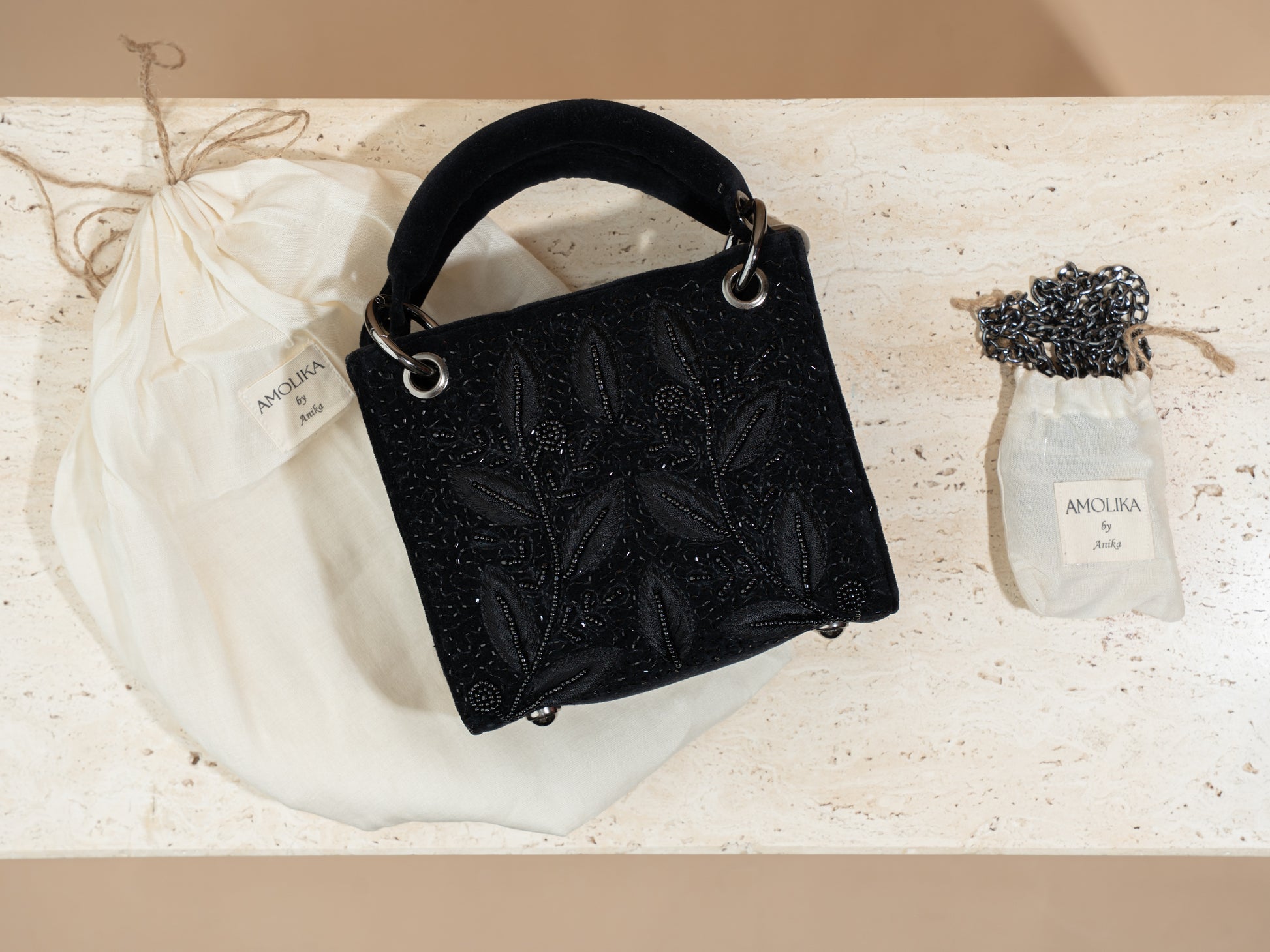 مصنوعة من قماش الجوت الأسود المفضل لدينا، مطرزة من الأمام والخلف بنمط جميل من أوراق الشجر والزهور بخيوط سوداء باستخدام تقنيات تطريز يدوي متنوعة. تعكس هذه الحقيبة أناقةً في كل عنصر، وتتميز بمساحة داخلية واسعة وجيب داخلي مفتوح لتنظيم أغراضك الأساسية. تأتي الحقيبة الصغيرة بمقبض حمل، وزر إغلاق، وسلسلة معدنية قابلة للفصل. كما تأتي كل حقيبة مع كيس غبار من الكتان.