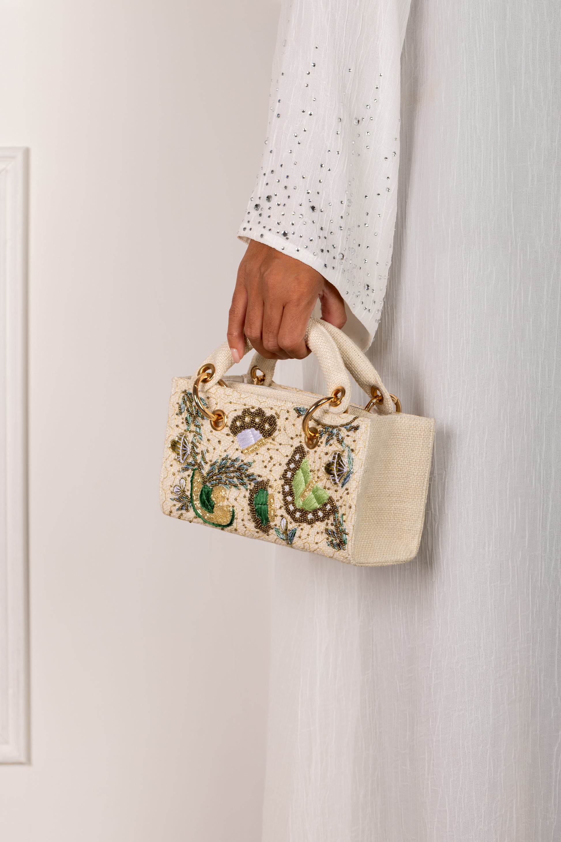 Introducing our exquisite hand-embroidered Green and Gold mini tote bag, a must-have for the modern woman who adores luxury and sophistication. Crafted with precision by skilled Indian artisans, this limited-edition masterpiece blends traditional artistry with contemporary elegance, making it the perfect accessory for weddings, soires, and exclusive gatherings. Premium Craftsmanship Intricately hand-stitched embroidery with delicate beadwork and sequins