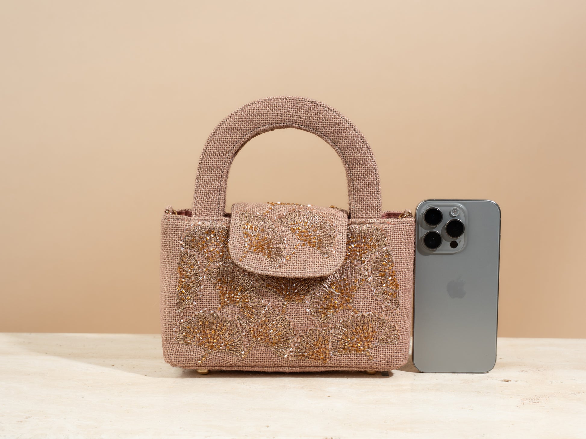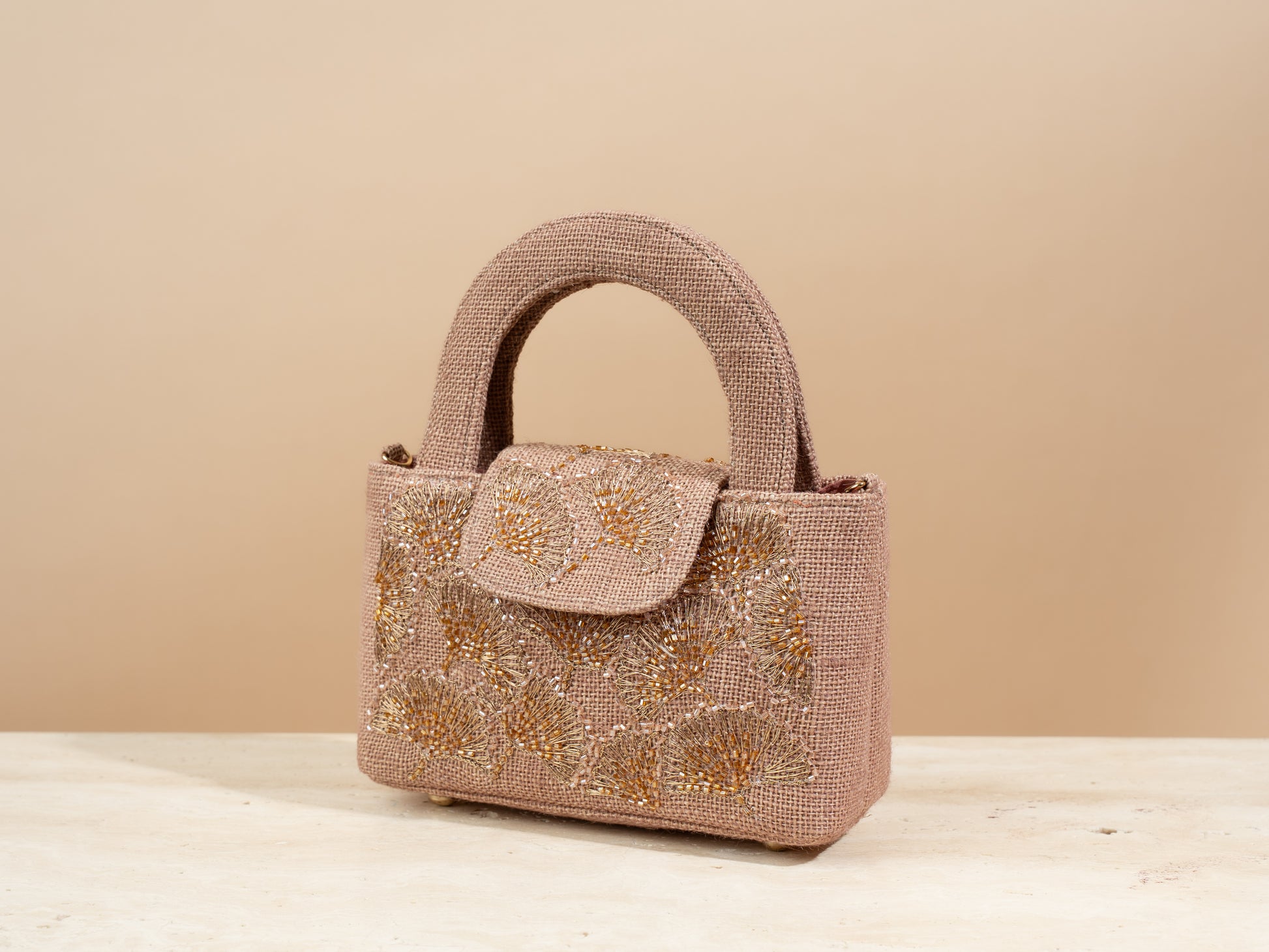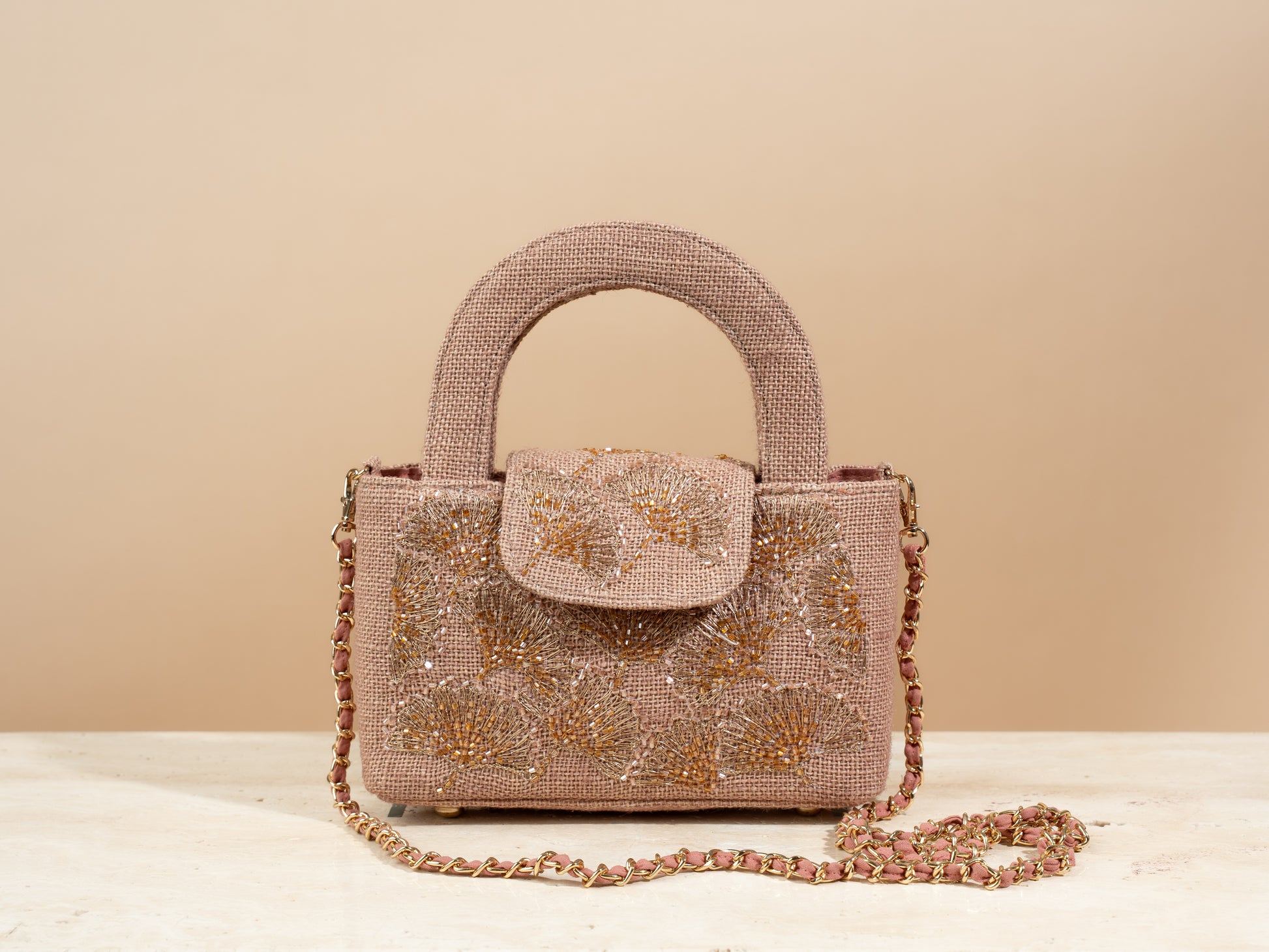 .The mini flap bag comes with a tote handle , a closing button , and a detachable metal chain .Every bag comes with a linen dustbag as well