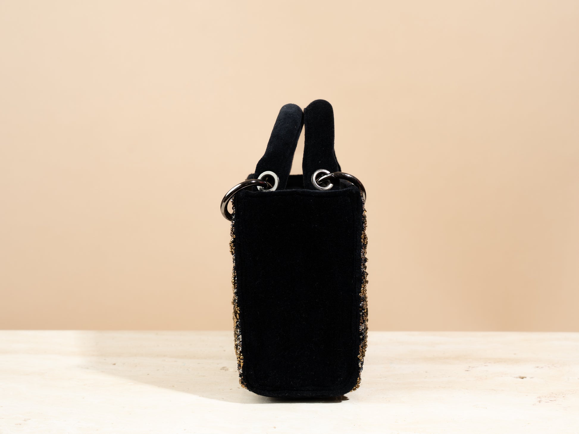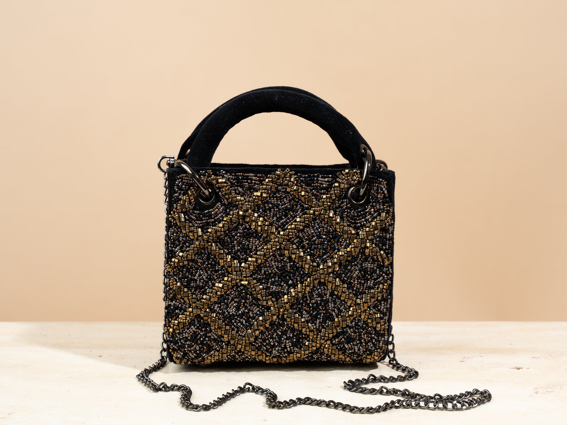 .The mini bag comes with a tote handle , a closing button , and a detachable metal chain .Every bag comes with a linen dustbag as well