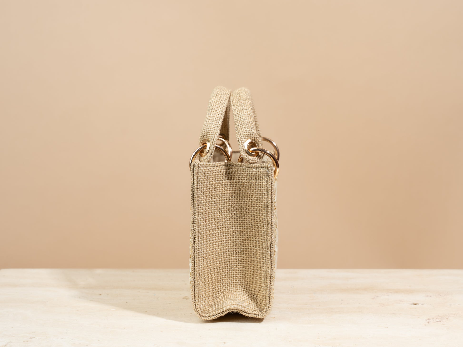 .The mini bag comes with a tote handle , a closing button , and a detachable metal chain .Every bag comes with a linen dustbag as well