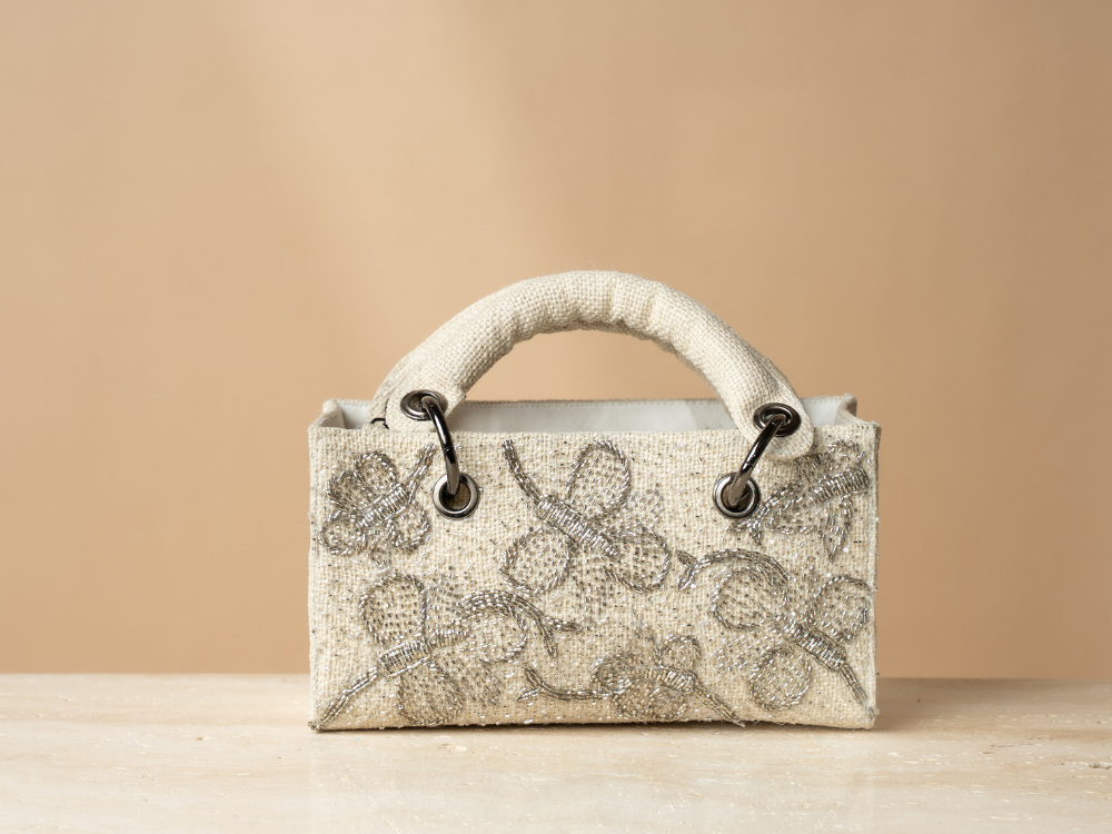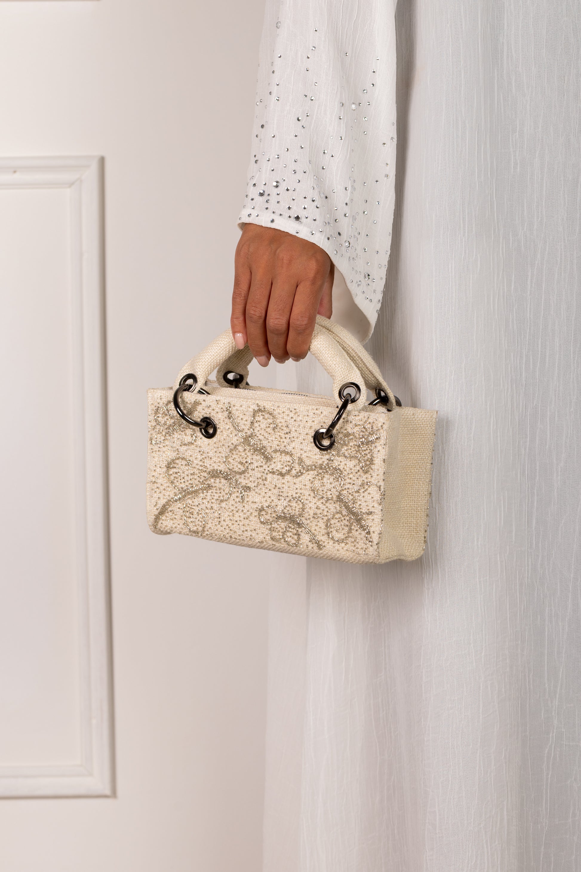 Introducing our exquisite hand-embroidered silver and offwhite mini tote bag, a must-have for the modern woman who adores luxury and sophistication. Crafted with precision by skilled Indian artisans, this limited-edition masterpiece blends traditional artistry with contemporary elegance, making it the perfect accessory for weddings, soires, and exclusive gatherings.